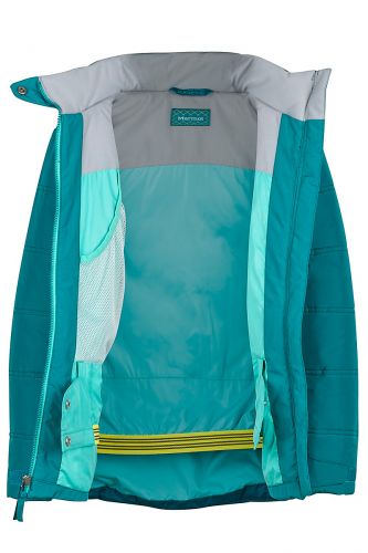 Детское теплое полу пальто. Можно носить как зимой в городе, так и использовать на лыжном склоне. Полностью проклеенные швы, 2ух слойная конструкция, водонепроницаемая и дышимая мембрана Marmot Membrain,наличие снежной юбки - делают это пальтишко универсальным компаньоном в любых приключения.
